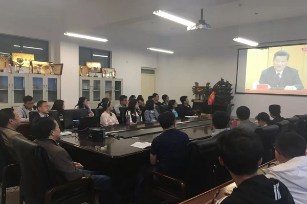 2019年4月30日上午,土木工程学院组织师生党员在院会议室集中收看了习总书记在纪念五四运动100周年大会上的重要讲话实况直播。学院党委书记赵万双、院长马守才、师生党员代表及入党积极分子代表收看了大会实况。