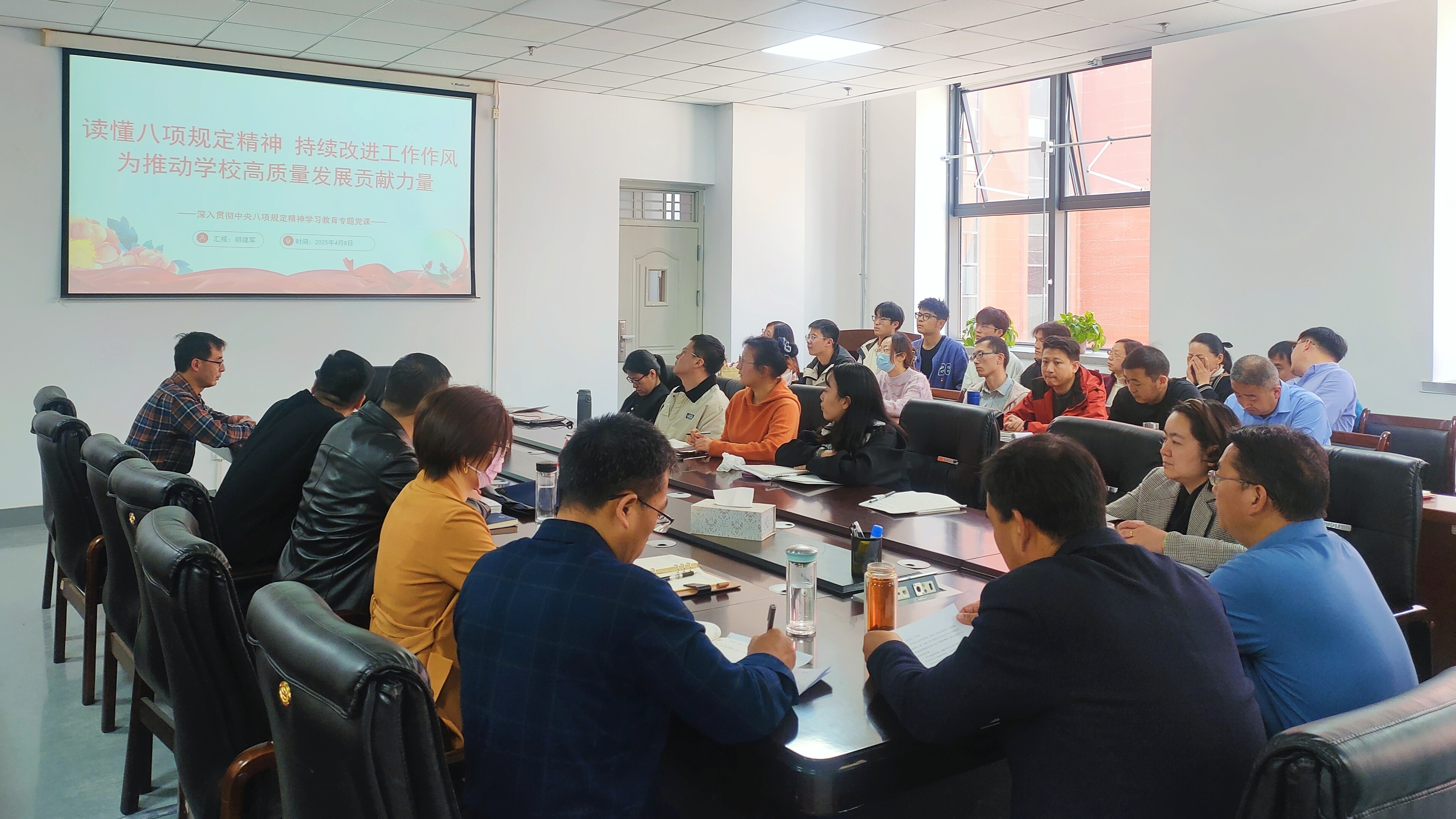 4月8日下午,学院召开深入贯彻中央八项规定精神学习教育辅导报告会。学校纪委、监察专员办公室纪检监察室主任胡建军作《读懂中央八项规定精神 持续改进工作作风 为推动学校高质量发展贡献力量》专题辅导报告。会议由学院党委书记李志刚主持。
