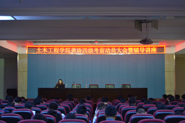 2016年5月23日晚七点,土木工程学院在一教八楼学术报告厅对15级学生进行了大学英语四级考前动员暨辅导讲座,学院副院长陈玉梅为学生做了精彩报告, 她强调大学英语四级考试即将临近,动员学生赶快行动起来,认真准备四级考试,并介绍了英语四、六级考试的“多题多卷”模式,详细讲述了各种题型的应对策略和技巧,特别就学生在短期内如何快速有效地提高考试成绩,交流了好的方法和经验。