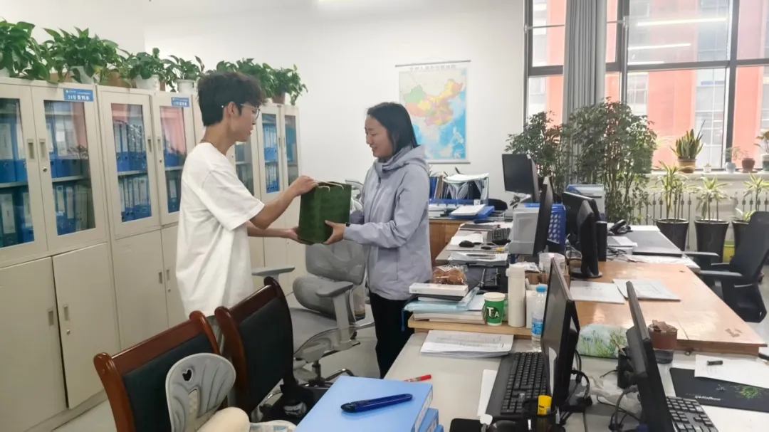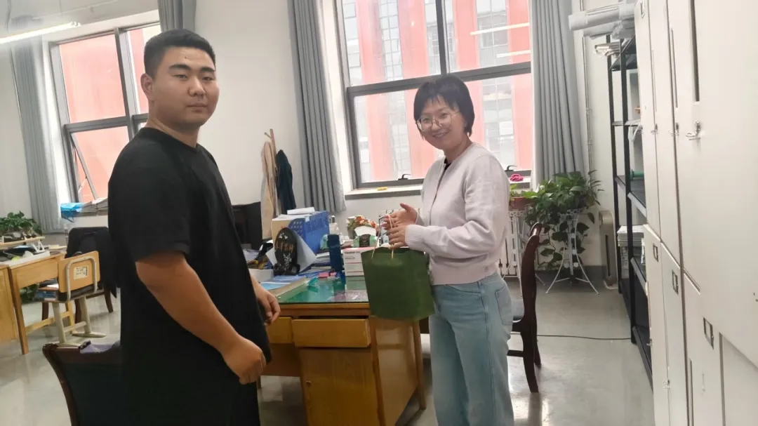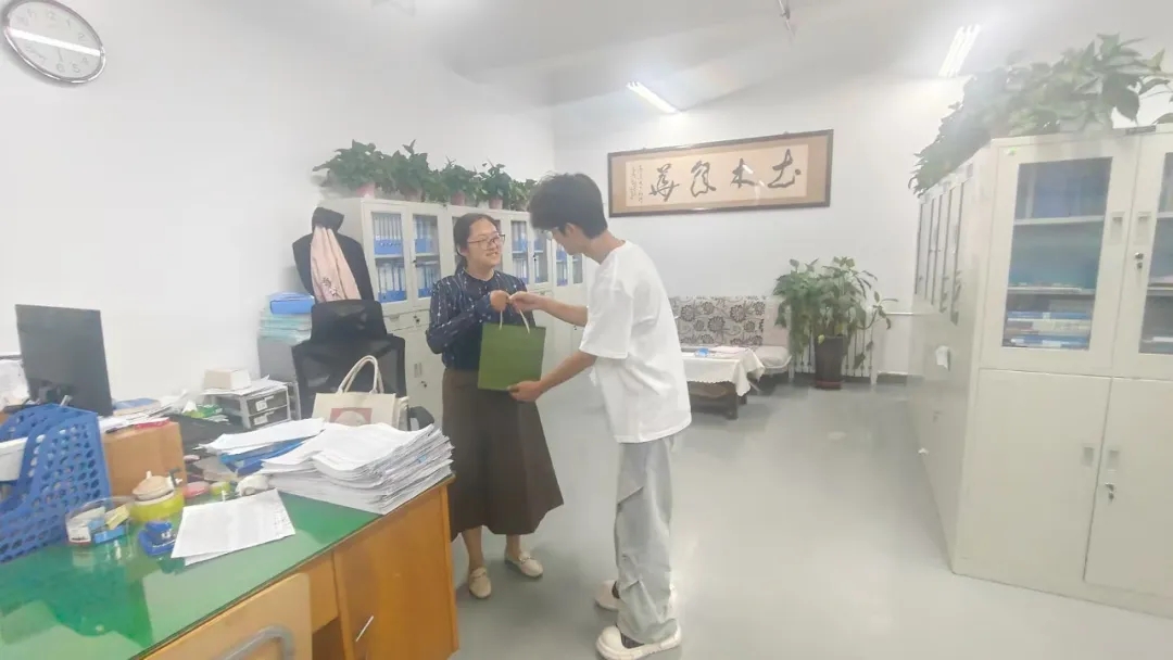 9月10日上午,学院团委学生会的学生代表们带着满满的敬意与祝福,将一份份精心挑选、搭配的礼物送至各位老师手中。这份特别的礼包既实用又充满心意,包含了传统养生艾草锤,寓意为老师们敲走疲惫,舒缓久站讲课、伏案工作的辛劳;中医保健刮痧板,寓意刮去劳累,带来健康与轻松;一对精致的小茶杯,寓意圆满成双,祝愿老师们生活美满;以及一盒清香醇厚的茶叶,希望老师们在繁忙之余能慢享茶香,品味生活片刻的宁静与闲暇。