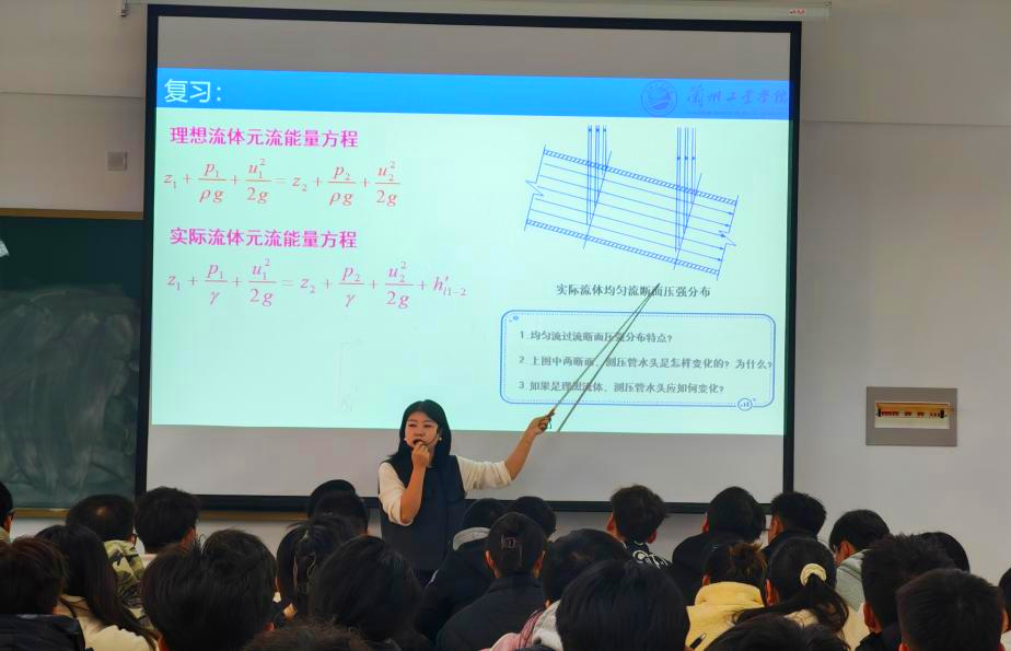 课堂上,杨黎黎老师通过温故知新,引导学生回顾理想流体元流能量方程的知识点。在新知导入环节,杨老师通过“船吸现象、飞机上天、火车吸人、纸张吹气实验”等生动案例,深入浅出地讲解了能量方程在生活中的应用。随后,她详细讲解了能量方程的解题步骤,并使用学习通组织了课堂测试,以加分竞答的形式巩固学习成果,巧妙地激发了学生的学习兴趣,营造了浓厚的课堂氛围。