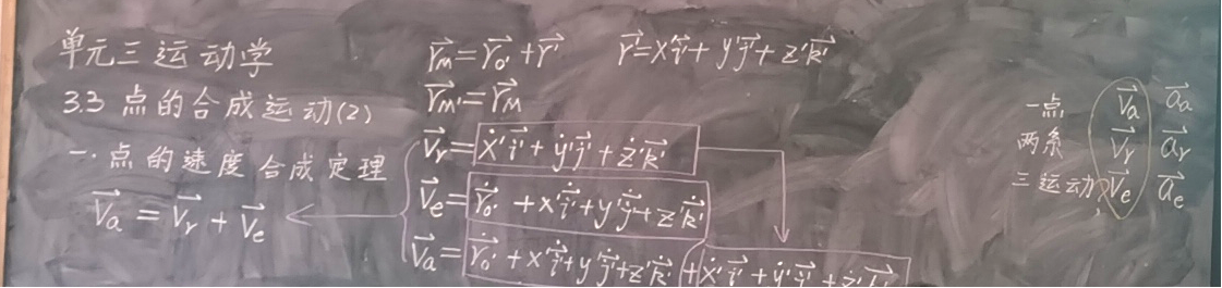 在讲授点的速度合成定理时,范老师巧妙地运用了动画,将抽象的速度合成过程直观地呈现在学生们面前。她详细解释了相对速度、牵连速度与绝对速度之间的关系,并通过典型例题让学生们深刻理解了这些概念。范老师的板书工整有力,每一个公式和推导过程都清晰可见,为学生们提供了很好的学习笔记。