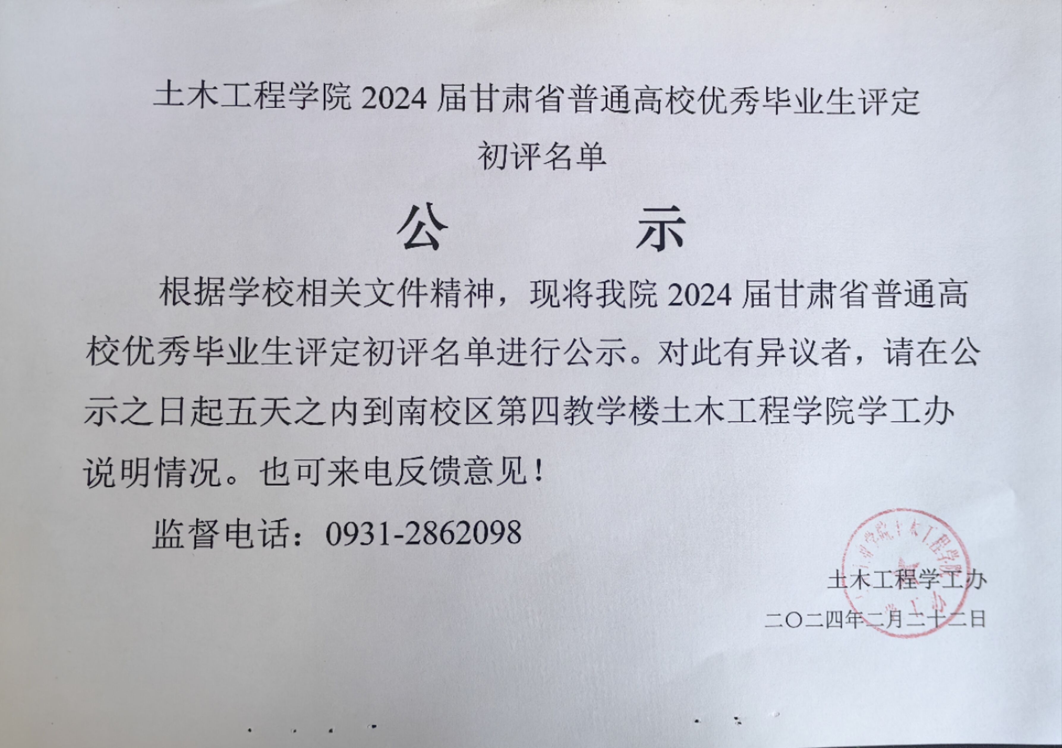 土木工程学院2024届甘肃省普通高等学校优秀毕业生评定初评名单公示