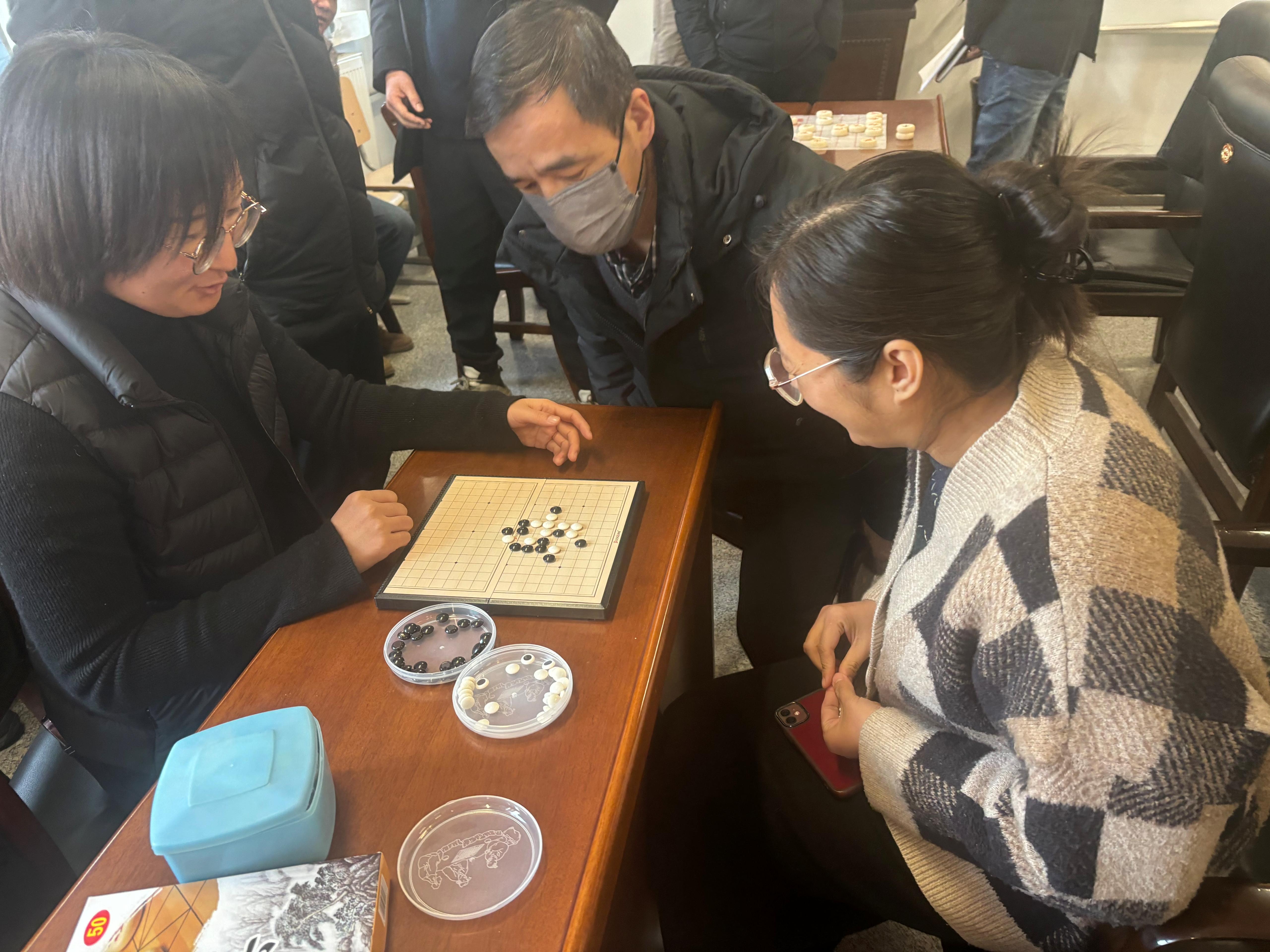 随着比赛的开始,选手们个个兴致满满地落座在棋盘两侧冷静观察、谨慎出招,手握棋子、心有大局,在行棋中三思而为,棋逢对手时更是果断出招、落子无悔,时而蹙眉思考,时而展眉轻笑,场外的围观者们也根据棋局的形势细声小语地讨论分析着,赛场看似安静的气氛下实则是激烈的拼杀,紧张较量着各自的棋艺,又体验着博弈带来的乐趣。