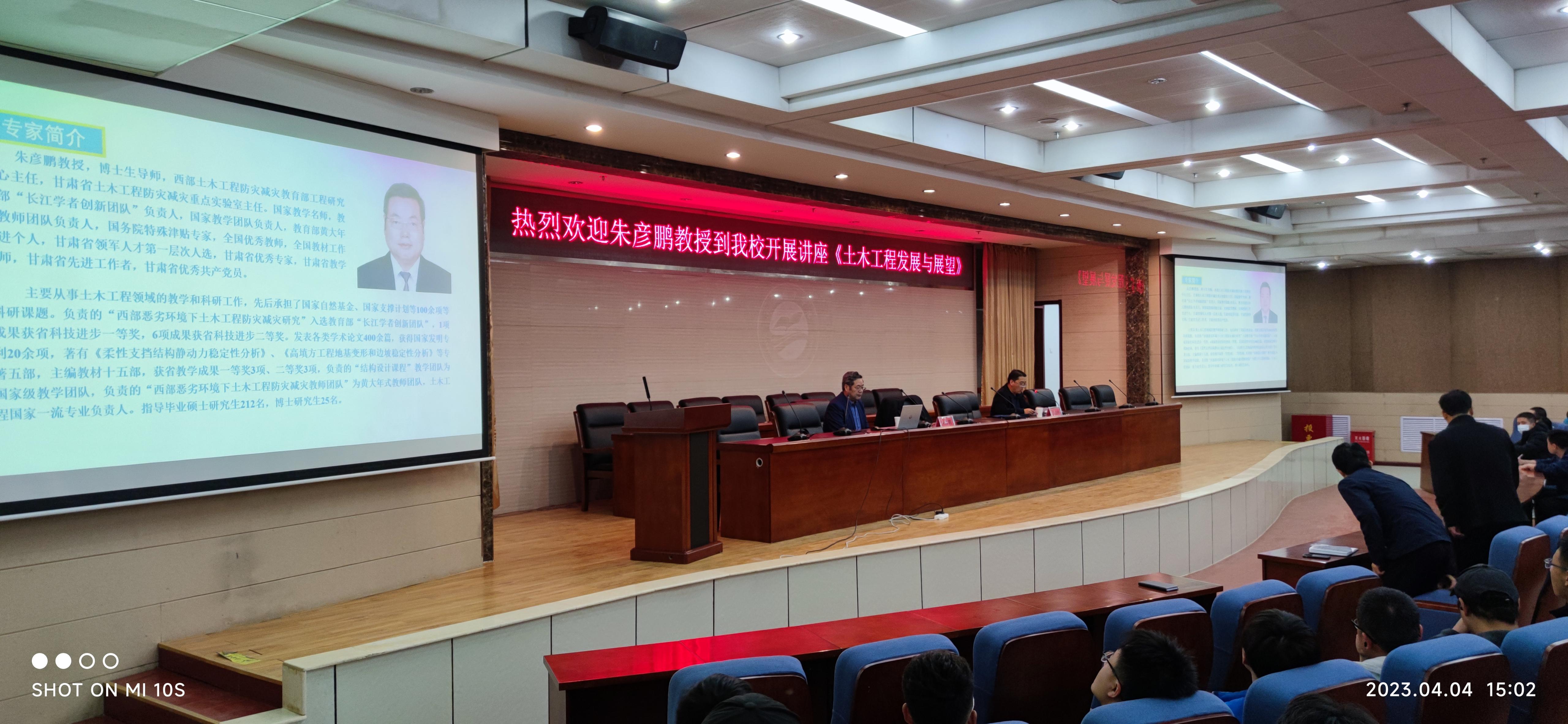 应土木工程学院邀请,2023年4月4日,兰州理工大学朱彦鹏教授为土木工程学院师生做了题为《土木工程发展展望》的报告。报告会由土木工程学院院长袁尚科主持,学院全体师生参加了报告会。