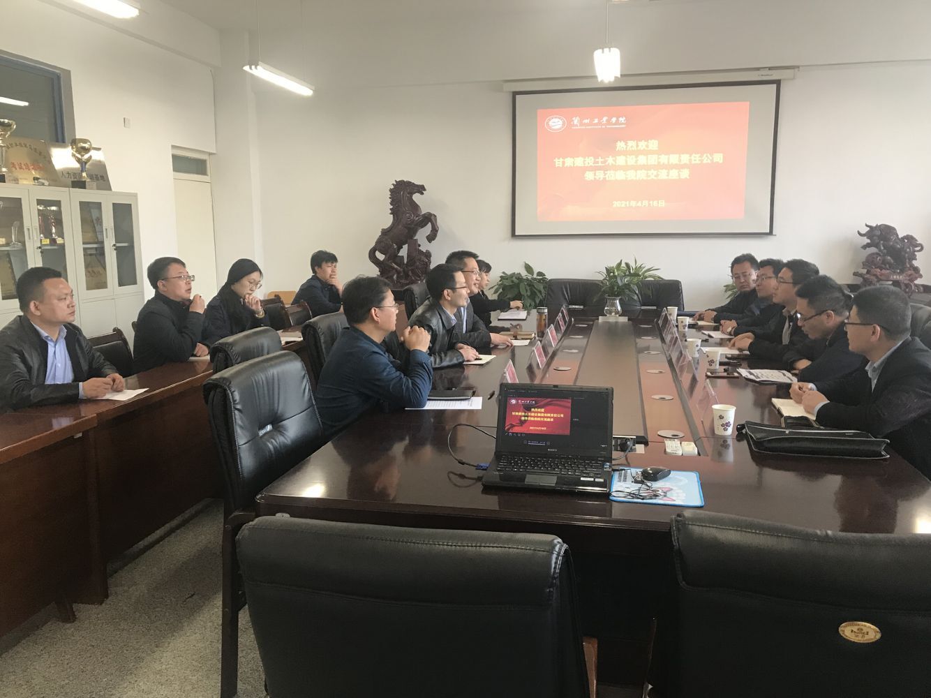 2021年4月16日,土木工程学院与甘肃建投土木建设集团有限责任公司校企合作洽谈会在土木工程学院会议室举行,学院领导及全体博士,土木建设集团研发部胡恩金部长一行5人出席会议。